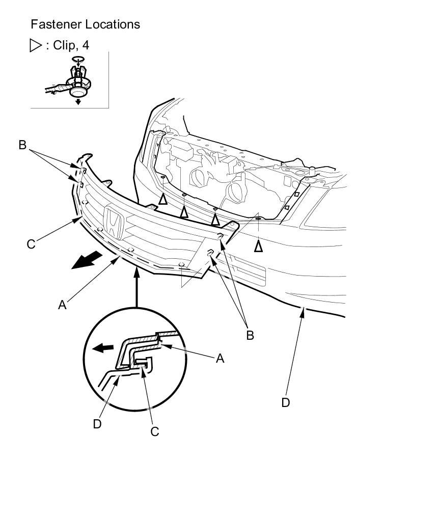 3. Release the hooks (B) ('08-10 models) and the ribs (C) from the front bumper (D).