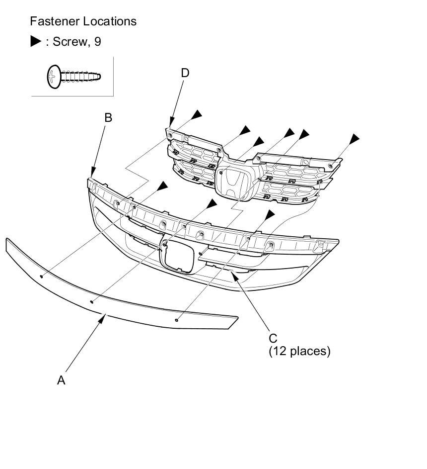 2. From behind the grille, remove the screws, then remove the front grille molding (A) from the front grille base (B).