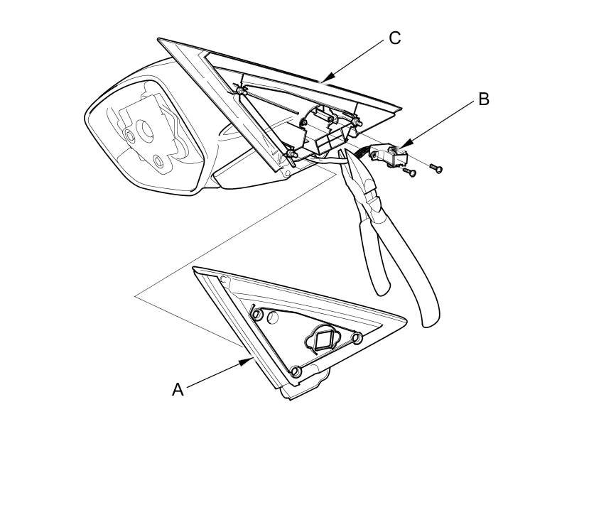 2. Remove the gasket (A), then remove the screw and power mirror 8P connector (B) from the mirror (C).
