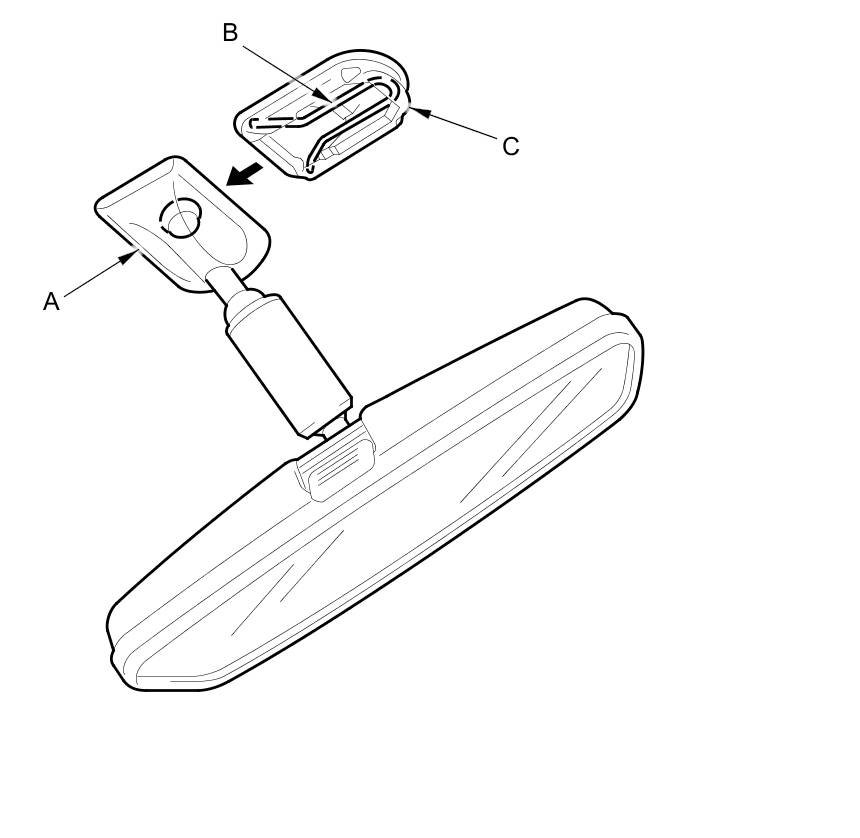 2. Slide the rearview mirror base (A) down toward the bottom of the windshield to detach it from the spring (B) in the mount (C).