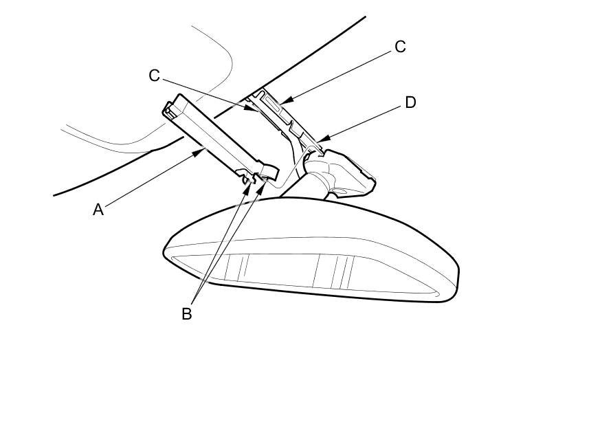 1. Pry out the rearview mirror harness cover (A) to release the hooks (B), then slide the cover rearward, and remove the cover by releasing the hooks (C) of the rearview mirror harness cover base (D).