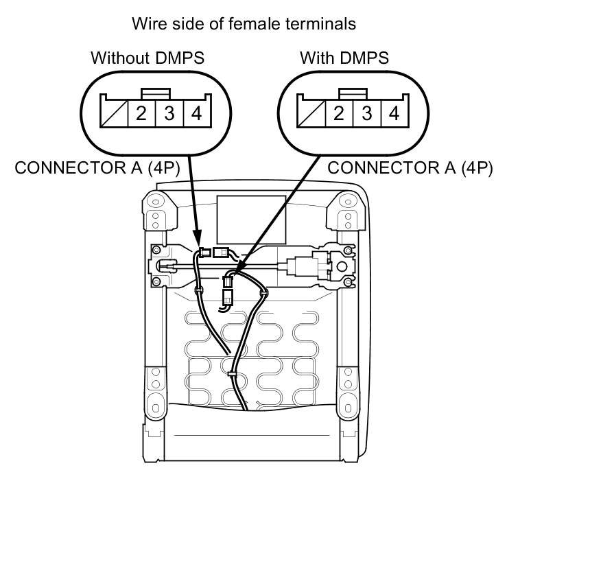 7. Check for continuity between seat heater connector A (4P) terminals No. 2 and No. 3, and terminals No. 3 and No. 4. There should be continuity.