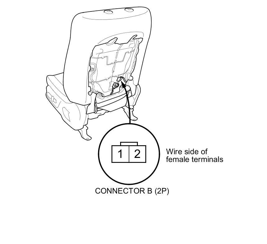 4. Check for continuity between seat heater connector B (2P) terminals No. 1 and No. 2. There should be continuity.