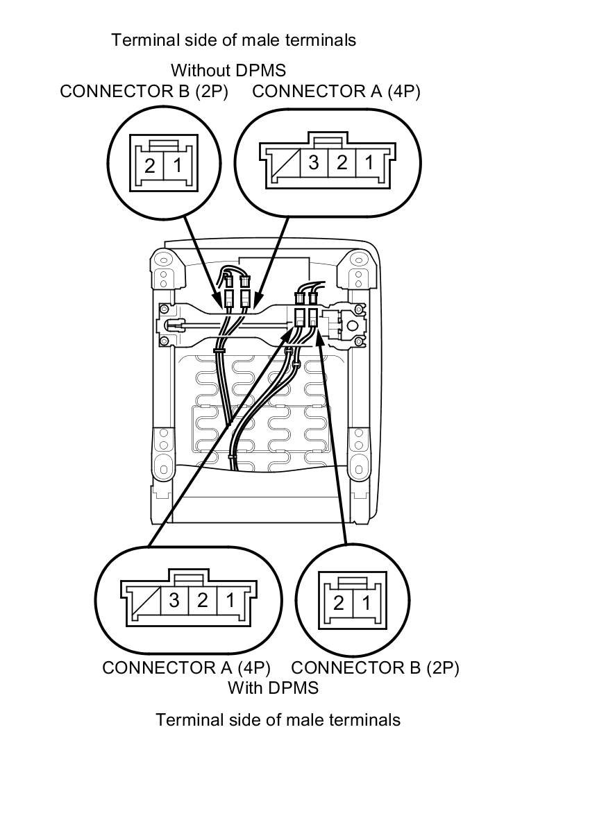 3. Lean the seat-back and disconnect the connector A (4P) and connector B (2P) from the seat heaters.
