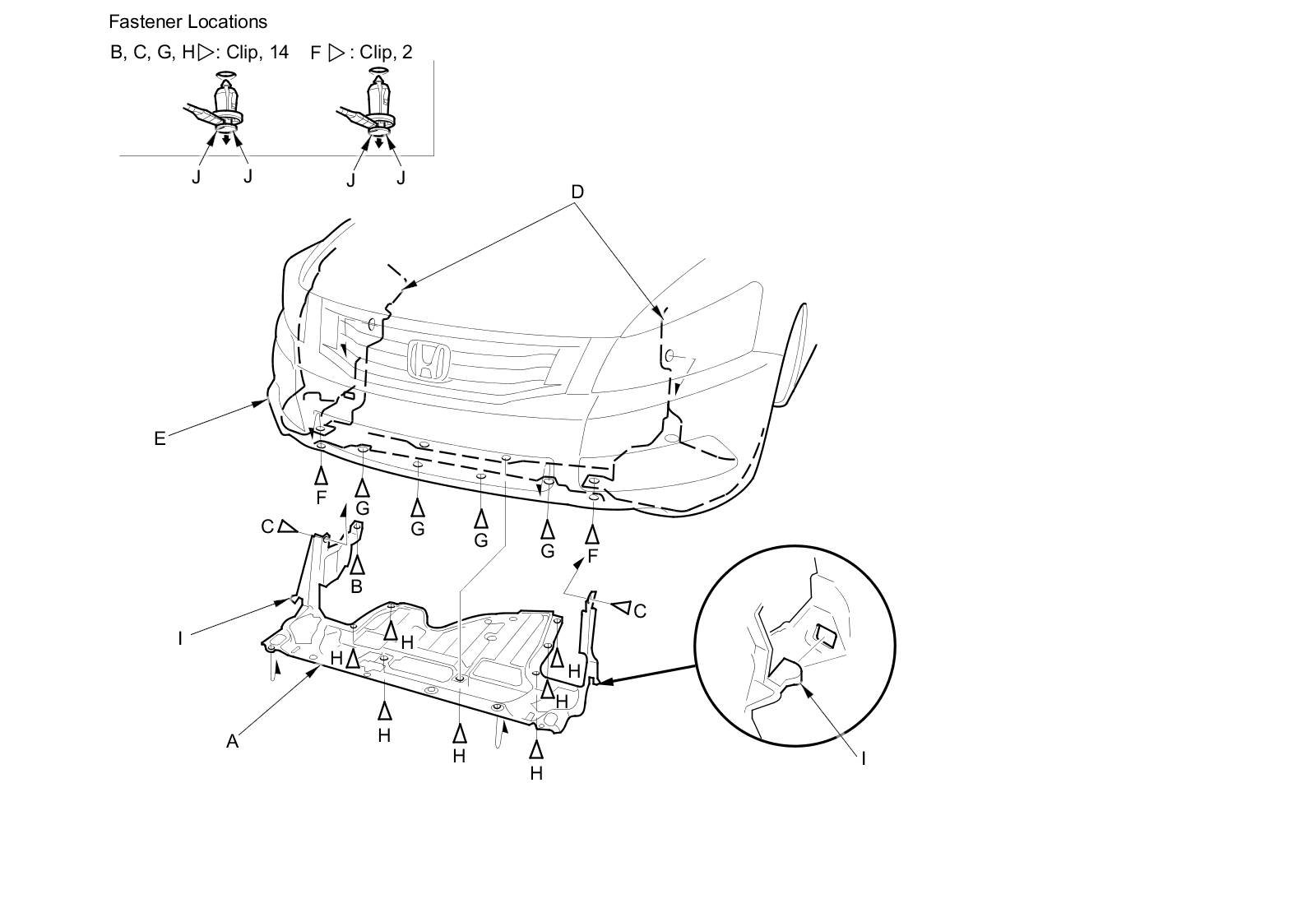 5. From under the body, detach the clips (H) that secure the front splash shield to the front subframe.