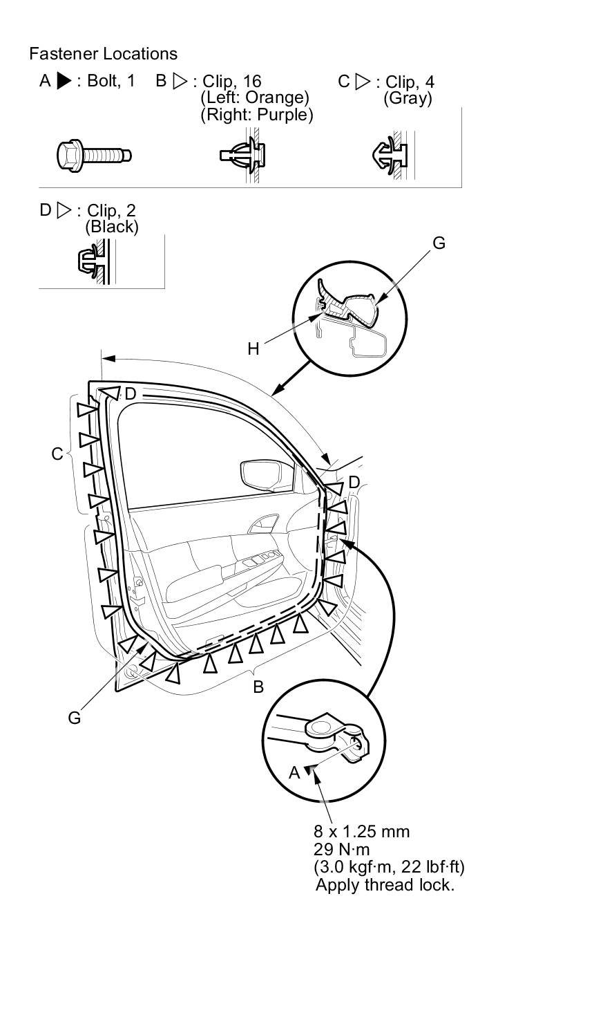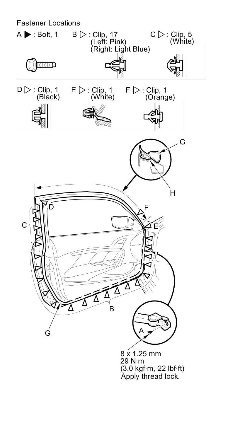 - Take care not to damage the front upper corner clip (black) (4-door) and the rear upper corner clips (black) because they are not available separately.
