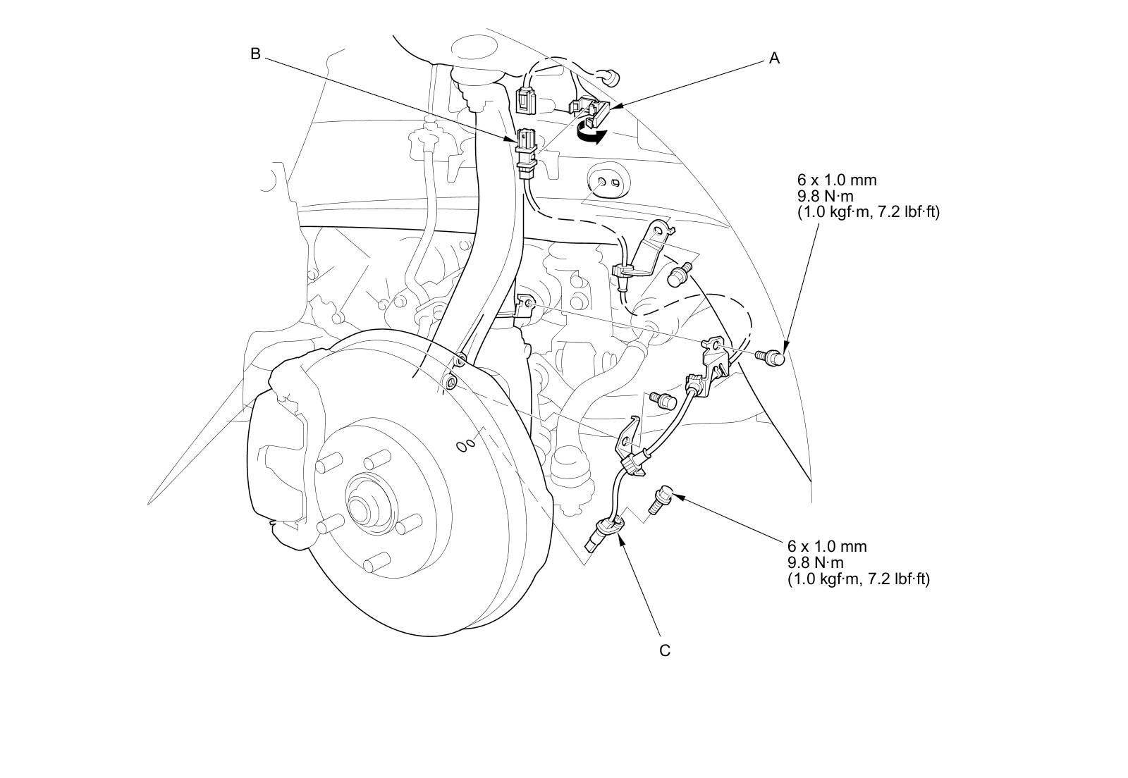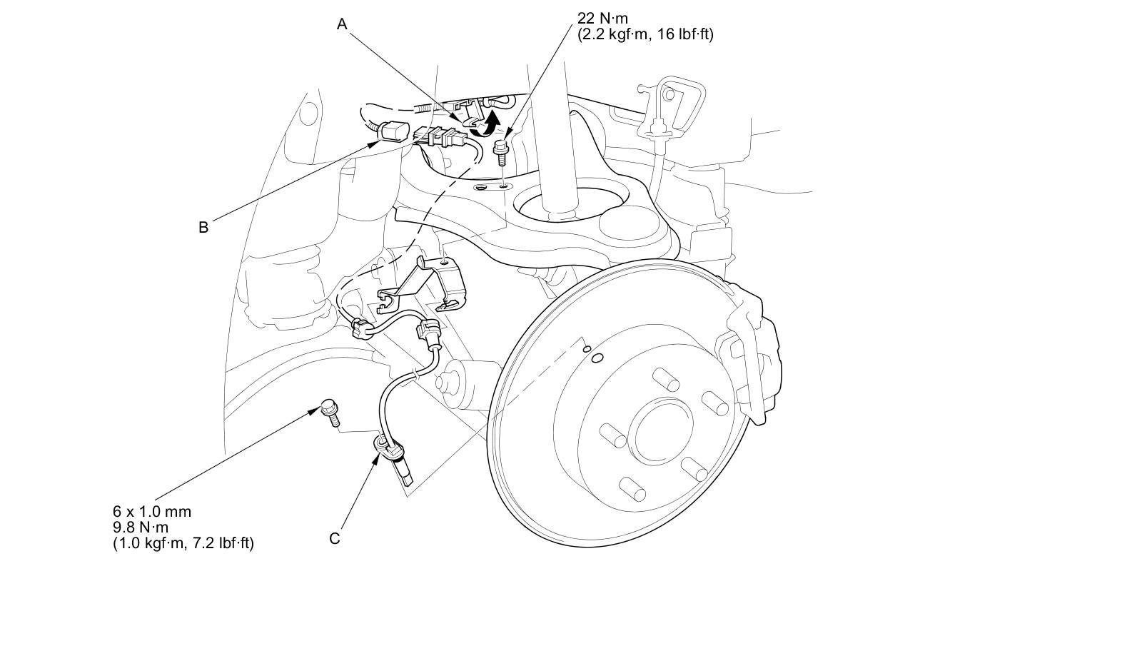3. Remove the clamps, the bolt, and the wheel speed sensor (C).