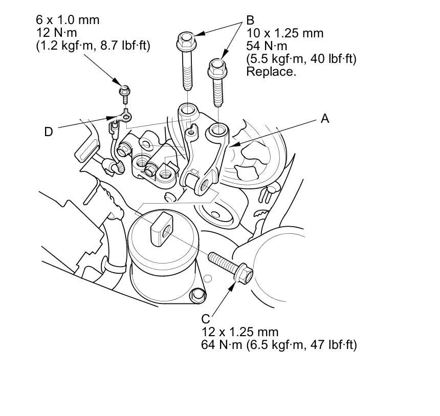 27. Tighten the new front engine mount mounting bolt (A), then install the front engine mount stop (B) using new nuts (C), and connect the vacuum hose (D).