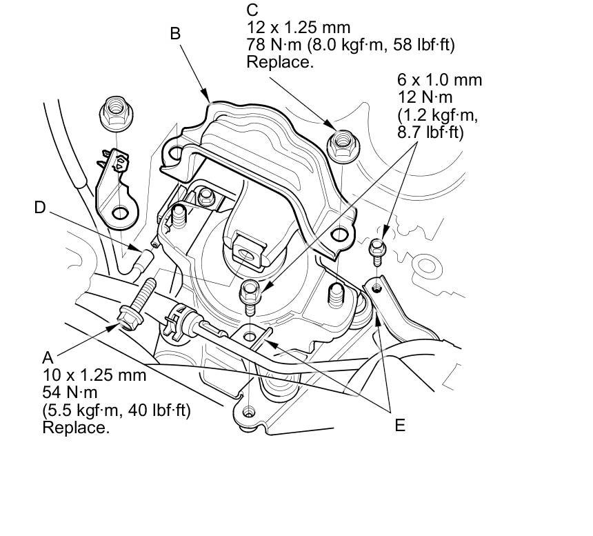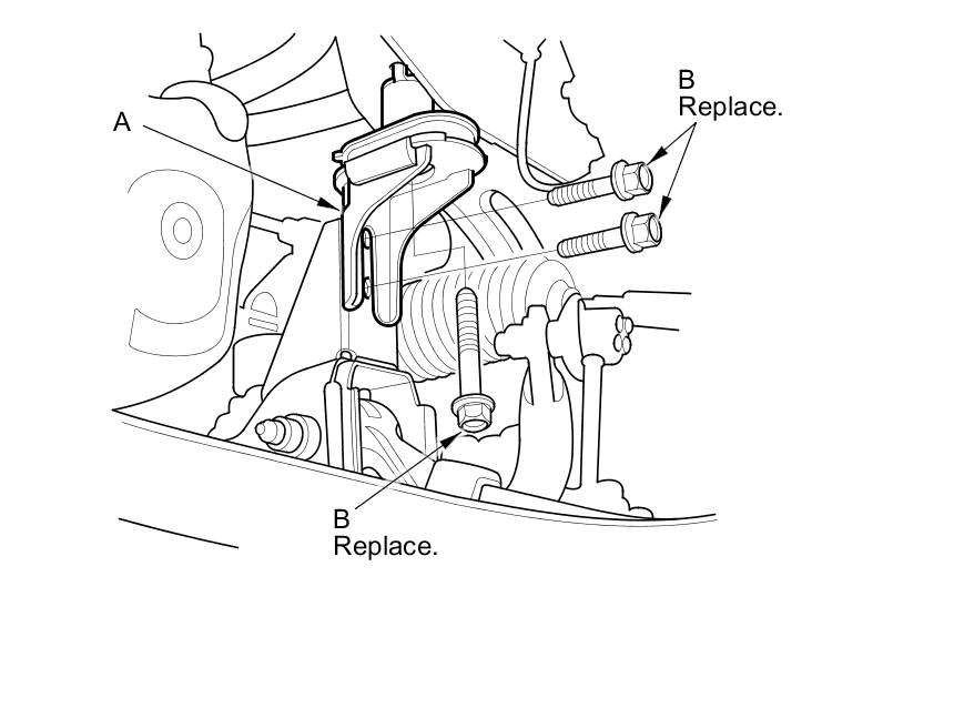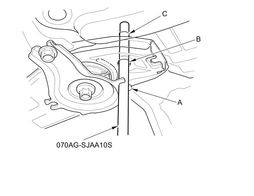 9. Install the side engine mount bracket (A), and tighten the new side engine mount bracket mounting bolts (B), then tighten the side engine mount mounting bolt (C).