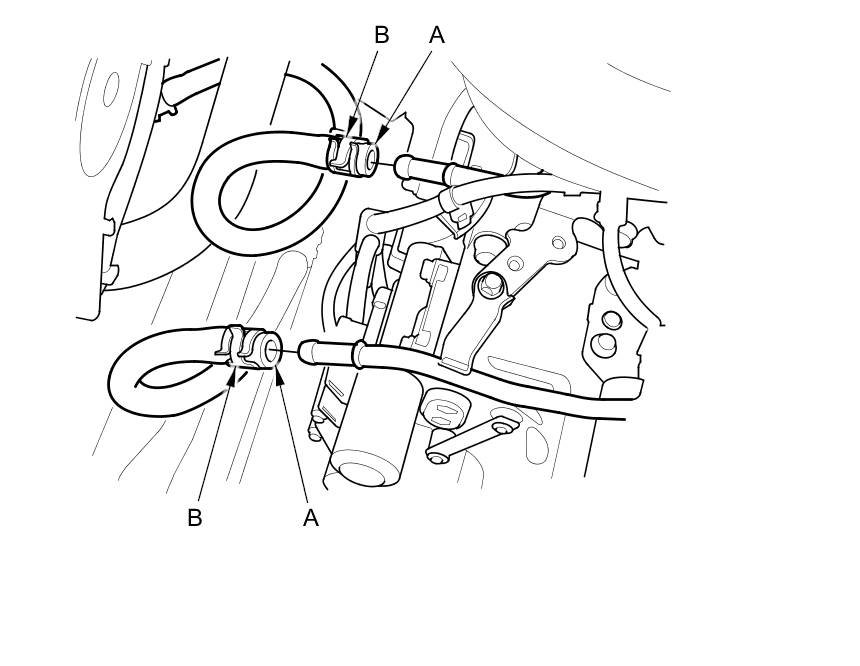 58. Connect the EVAP canister hose (A) and the brake booster vacuum hose (B).