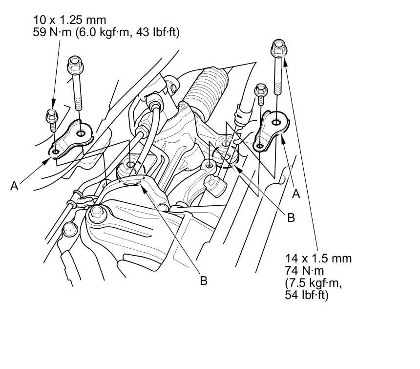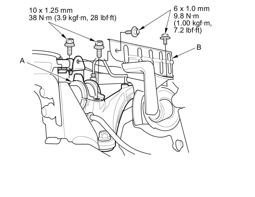 14. Install the subframe middle rubber mount (A) on both sides, then loosely tighten the new subframe middle mount mounting bolts (B).