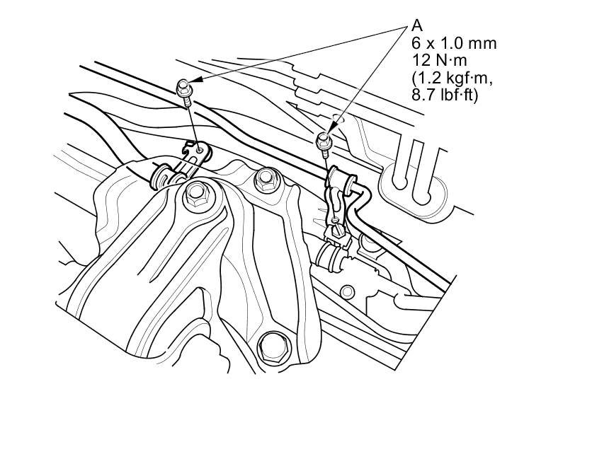 5. Tighten the new upper transmission mount bracket mounting bolts (A) to the specified torque.