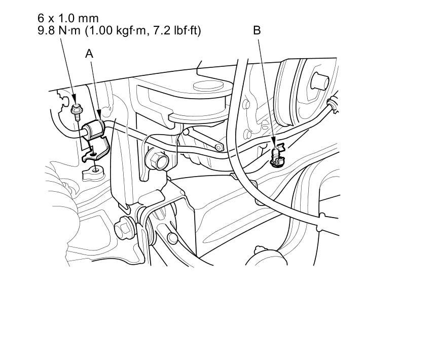 42. Install the power steering fluid line bracket (A), and clamp the power steering fluid line clamp (B) on the front subframe.
