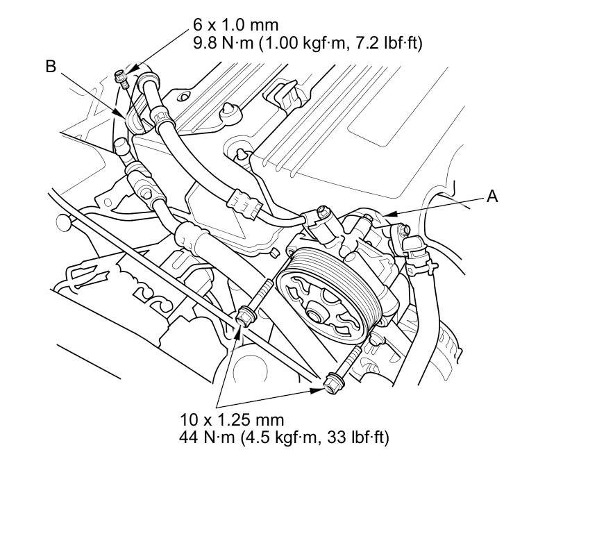 55. Install the power steering pump (A), and the power steering pump outlet hose bracket (B).