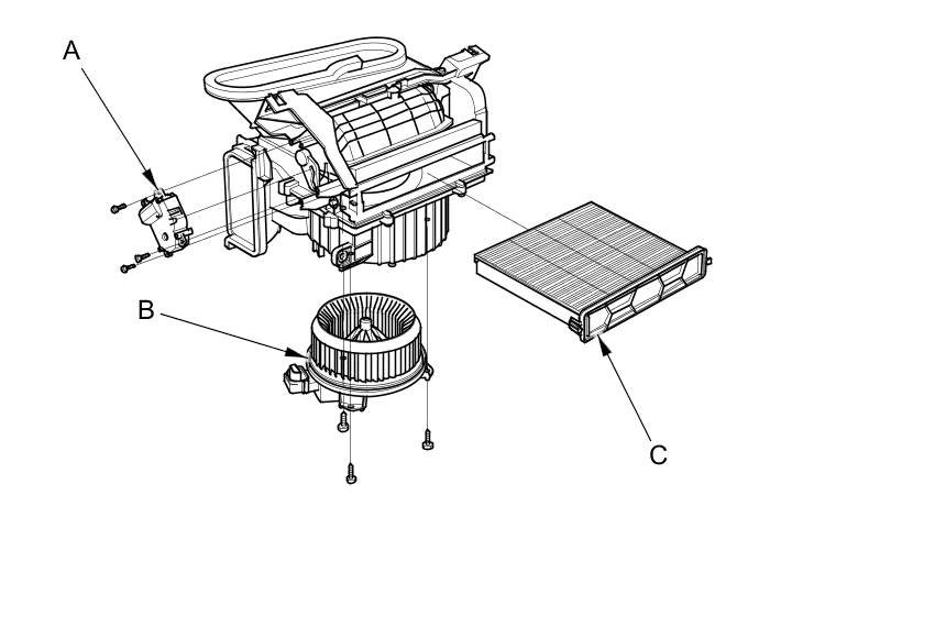 - The recirculation control motor (A), the blower motor (B), and the dust and pollen filter (C) can be replaced without removing the blower unit.