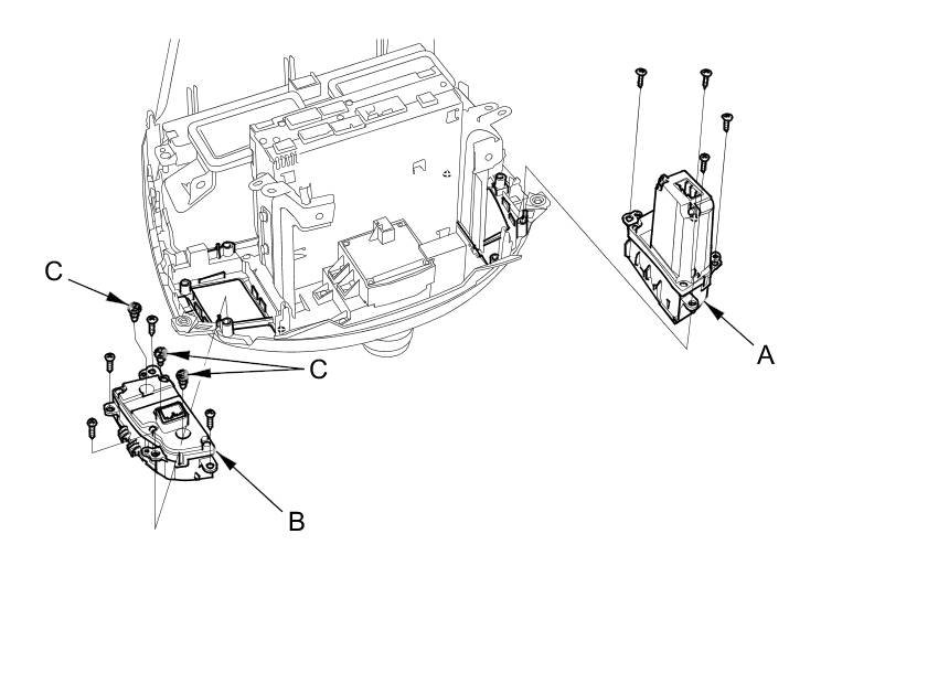 2. Remove the self-tapping screws and the driver's climate control switch (A) and passenger's climate control switch (B). If necessary, replace the bulbs (C).