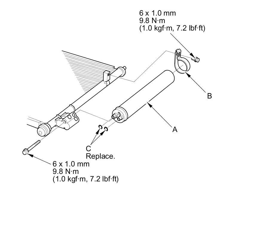2. Remove the bolts from the A/C condenser, then remove the receiver/dryer (A), the bracket (B), and the O-rings (C).