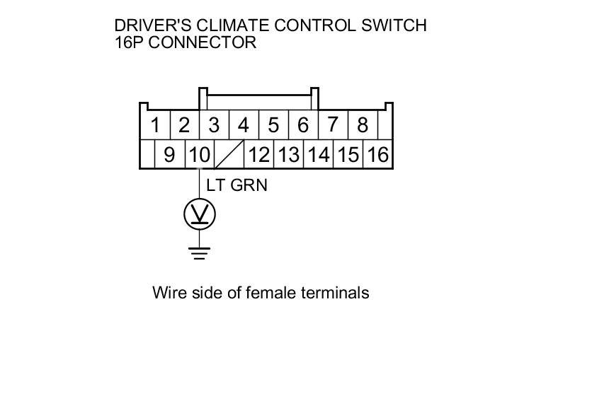 14. Measure the voltage between driver's climate control switch 16P connector terminal No. 10 and body ground.