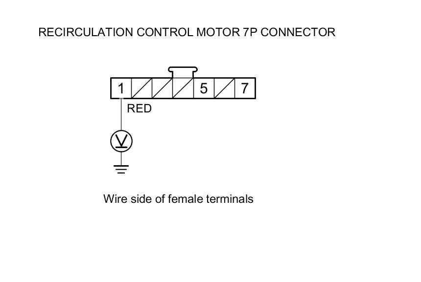 4. Measure the voltage between recirculation control motor 7P connector terminal No. 1 and body ground.