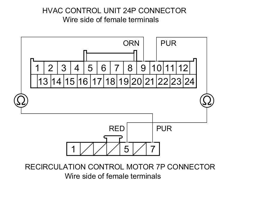 11. Check for continuity between the following terminals of the HVAC control unit 24P connector and the recirculation control motor 7P connector.