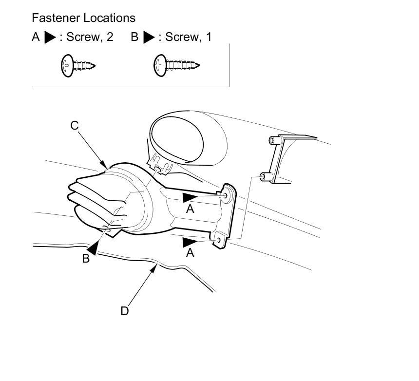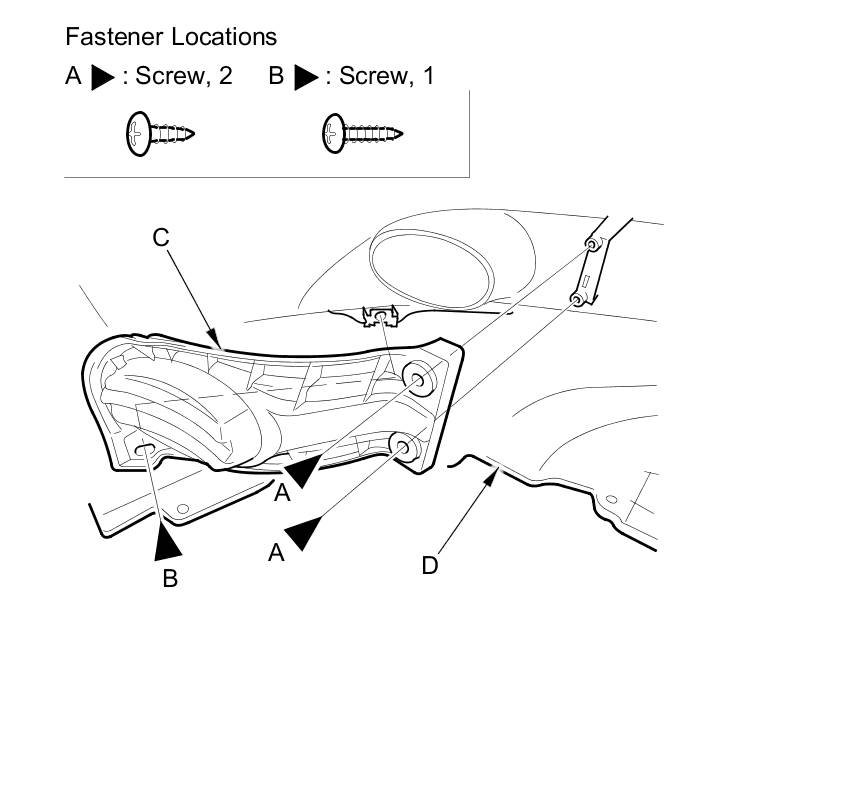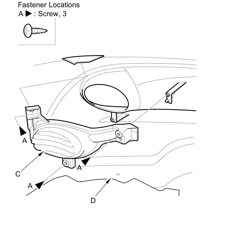 2. Remove the screws (A, B), then remove the front bumper fog light cover (C) from the front bumper (D).