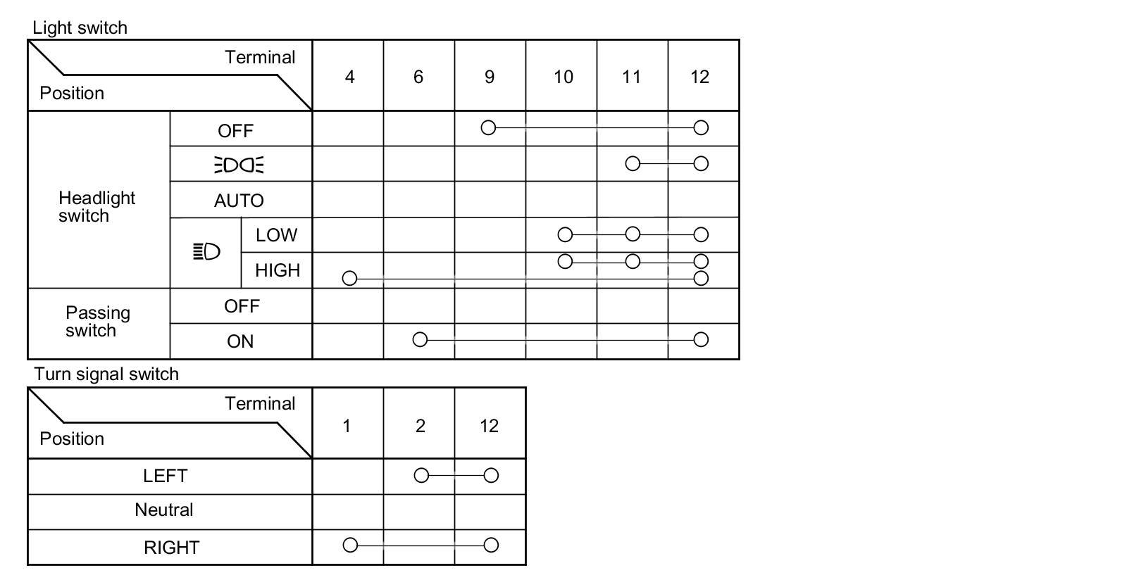 - If the terminals look OK, check for continuity between the terminals in each switch position according to the tables.