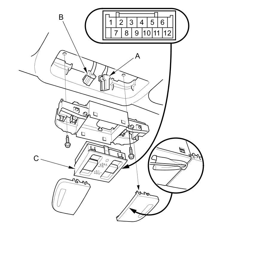 2. Disconnect the moonroof switch 12P connector (A) and the map light 3P connector (B).