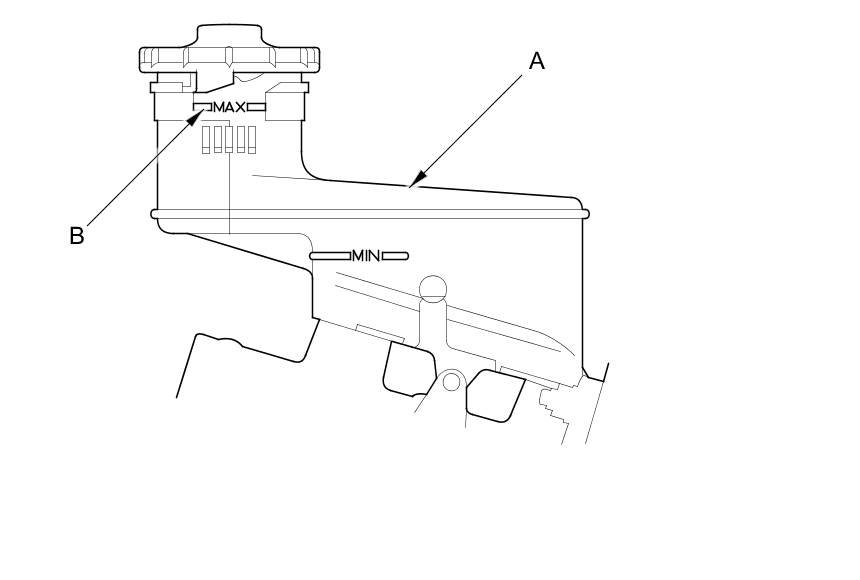 1. Make sure the brake fluid level in the reservoir (A) is at the MAX (upper) level line (B).