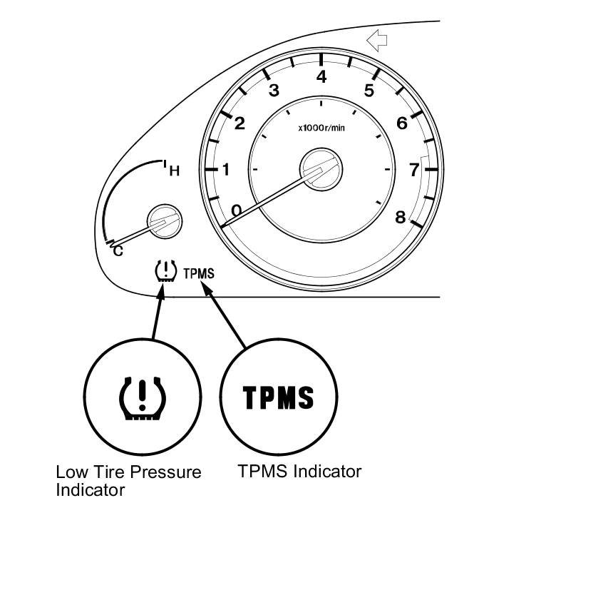 If the system is OK, the TPMS indicator and the low tire pressure indicator should come on when you turn the ignition switch to ON (II), and then go off 2 seconds later. If they don't, there is a problem with the system.