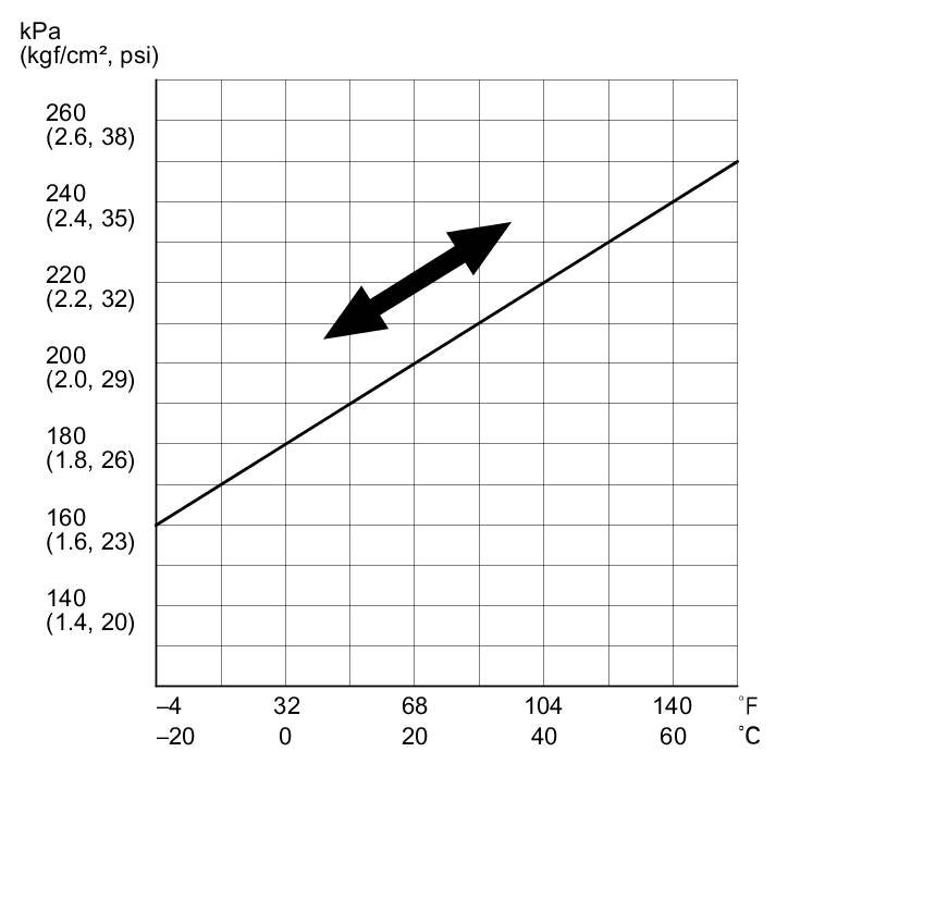 Tire pressures increase slightly as the temperature in the tires rises during driving. Pressures can also increase or decrease slightly with changes in outside air temperature. A temperature change of about 18 °F(10 °C) changes tire pressure by about 10 kPa (0.1 kgf/cm2, 1.5 psi). If the temperature drops, tire pressure could decrease enough to turn on the low tire pressure indicator, but later, the tire temperature could increase enough to turn the indicator off. To resolve a complaint of such intermittent indications, confirm and clear the stored DTC(s) and check the tire pressures. Then explain to the customer how temperature changes can affect the system.