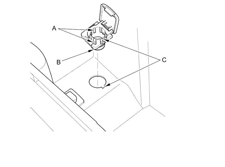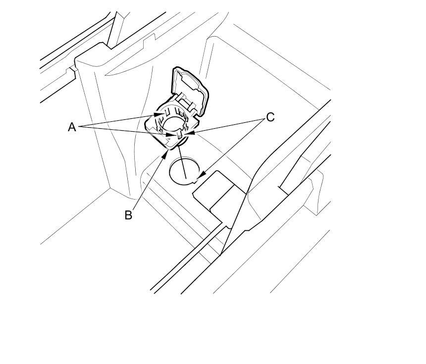 10. Gently depress the tabs (A), then remove the housing (B) from the panel. Note the location of the indexing tabs (C).