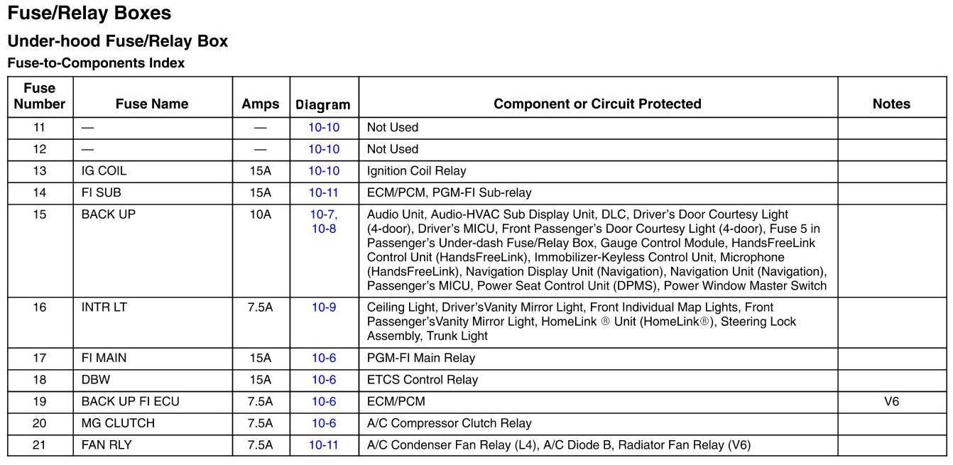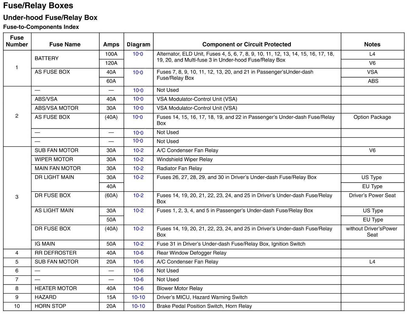 Under-Hood Fuse/Relay Box - Fuse-to-Components Index