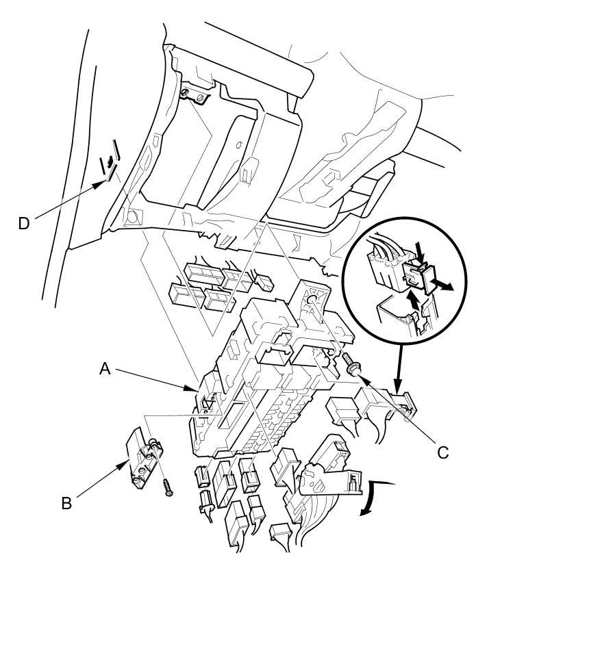 8. Remove the mounting bolt (C), release the tab (D), and pull the driver's under-dash fuse/relay box away from the body.
