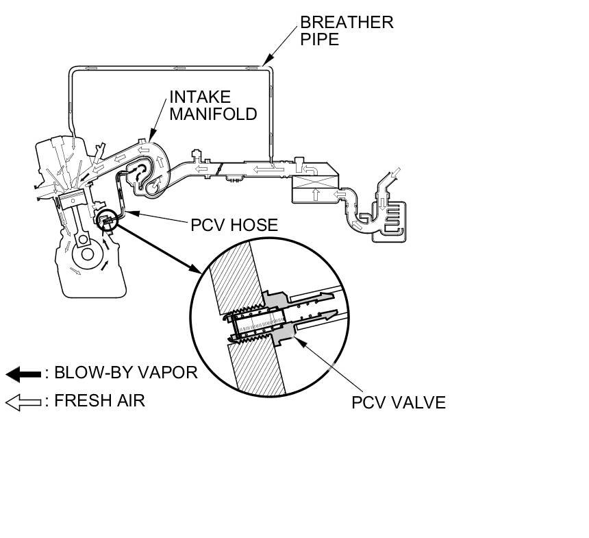 The PCV valve prevents blow-by gasses from escaping into the atmosphere by venting them into the intake manifold.