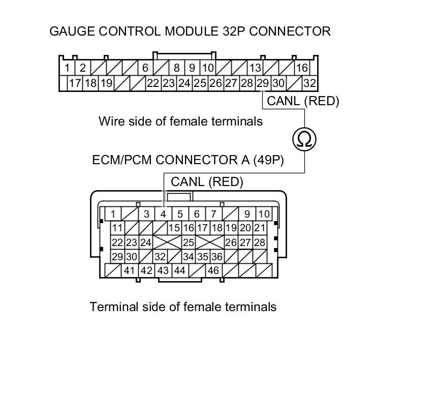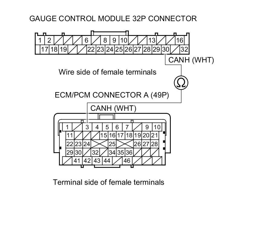 7. Check for continuity between ECM/PCM connector terminal A3 and gauge control module 32P connector terminal No. 30.