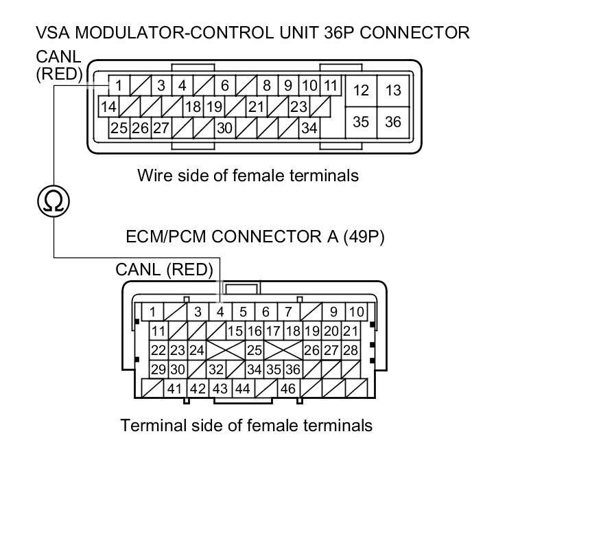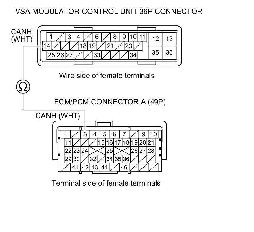 8. Check for continuity between ECM/PCM connector terminal A3 and VSA modulator-control unit 36P connector terminal No. 14.