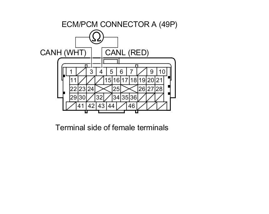 12. Measure the resistance between ECM/PCM connector terminals A3 and A4.