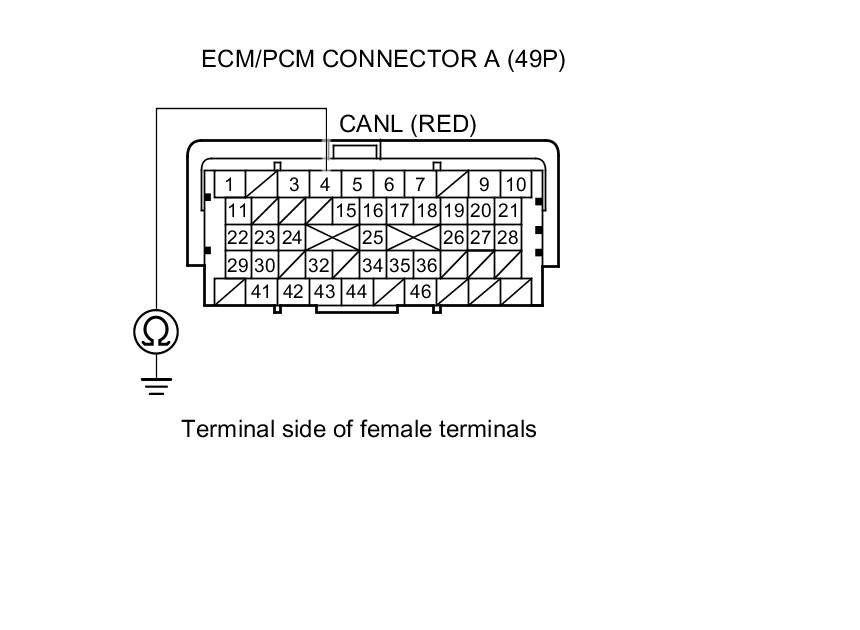 6. Check for continuity between ECM/PCM connector terminals A3 and A4.