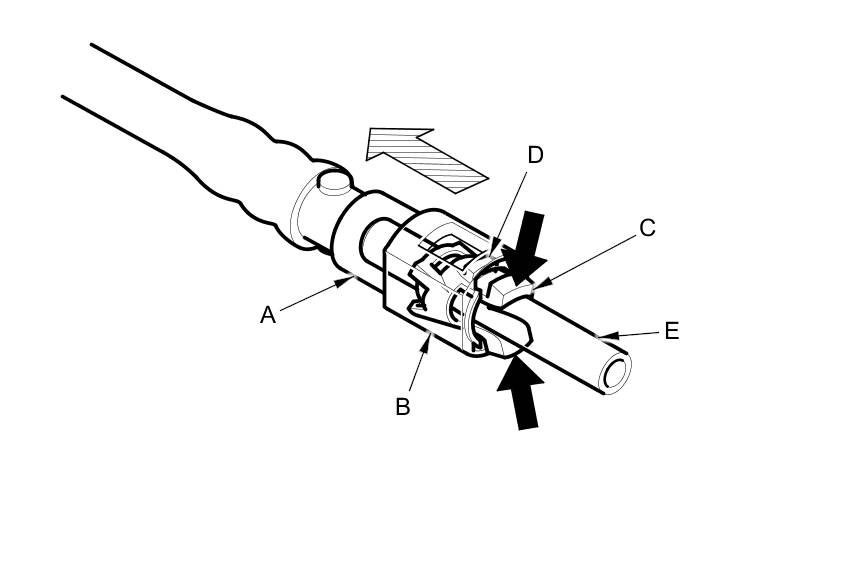 13. Disconnect the quick-connect fitting (A): Hold the connector (B) with one hand, and squeeze the retainer tabs (C) with the other hand to release them from the locking tabs (D). Pull the connector off.