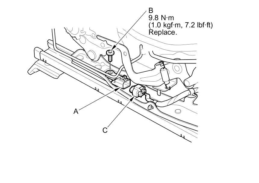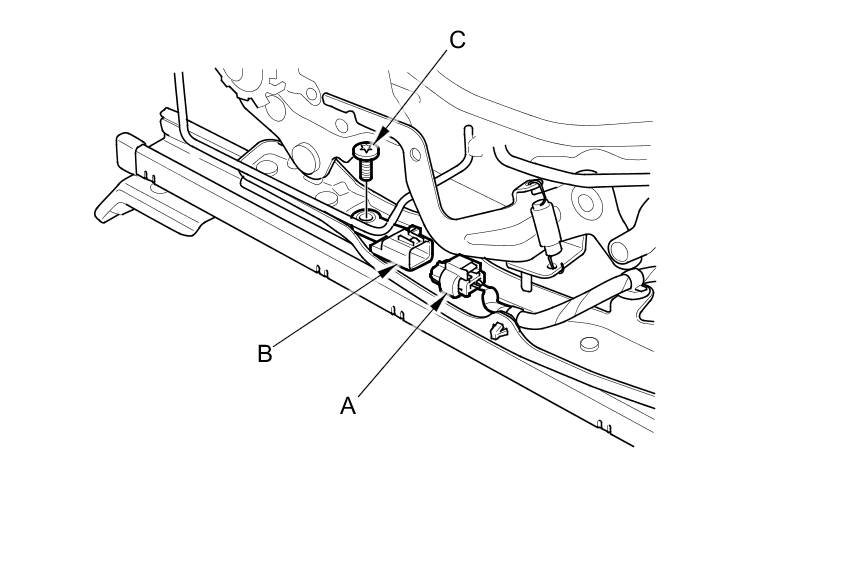 1. Install the driver's seat position sensor (A) with the new TORX bolt (B), using a TORX T30 bit. Connect the driver's seat position sensor harness 2P connector (C) to the driver's seat position sensor.