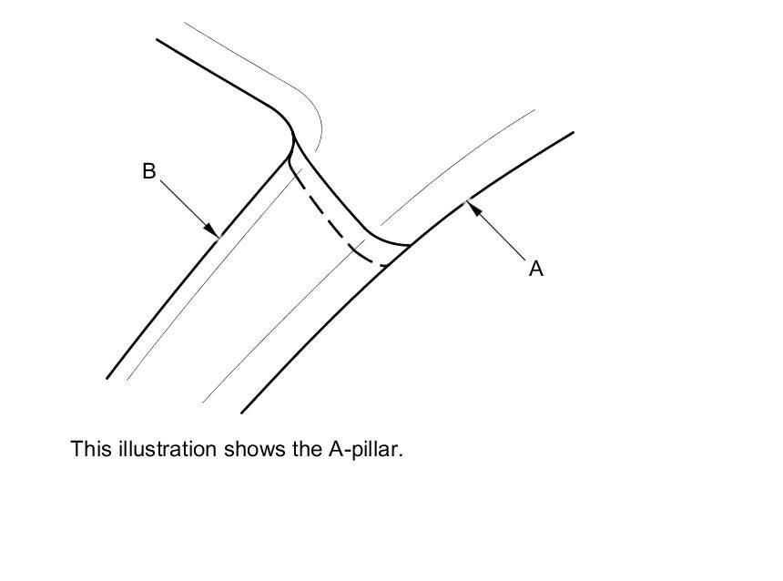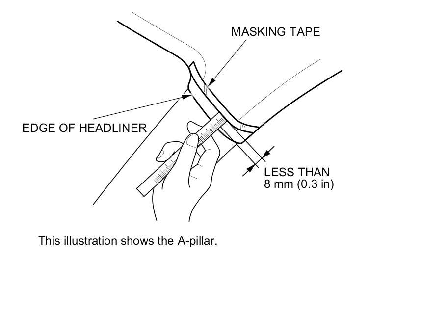 To prevent the side curtain airbag from deploying and damaging the pillar trim (A-pillar trim, B-pillar trim, C-pillar trim), the overlap between the headliner and pillar trim must be less than 8 mm (0.3 in). To check the overlap, do this: