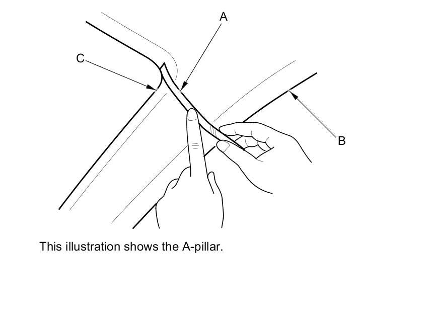 2. Apply masking tape (A) to the headliner (B) to mark the upper edge of the pillar trim (C).