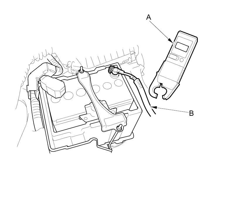 10. Attach the LH41 AC/DC low current clamp meter (A) to the battery ground cable (B). Follow the equipment manufacturer's instructions, then measure the parasitic draw.