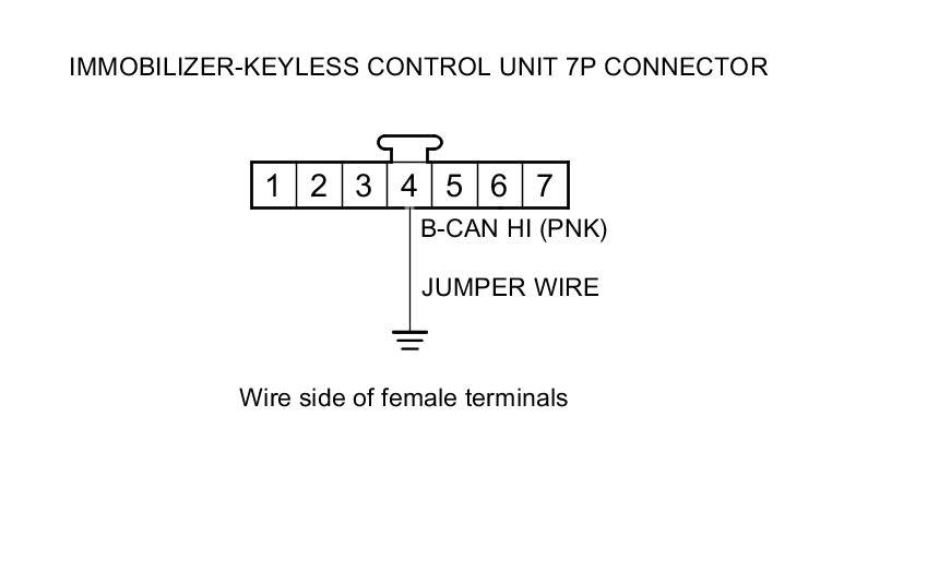 22. Connect immobilizer-keyless control unit 7P connector terminal No. 4 and body ground with a jumper wire.
