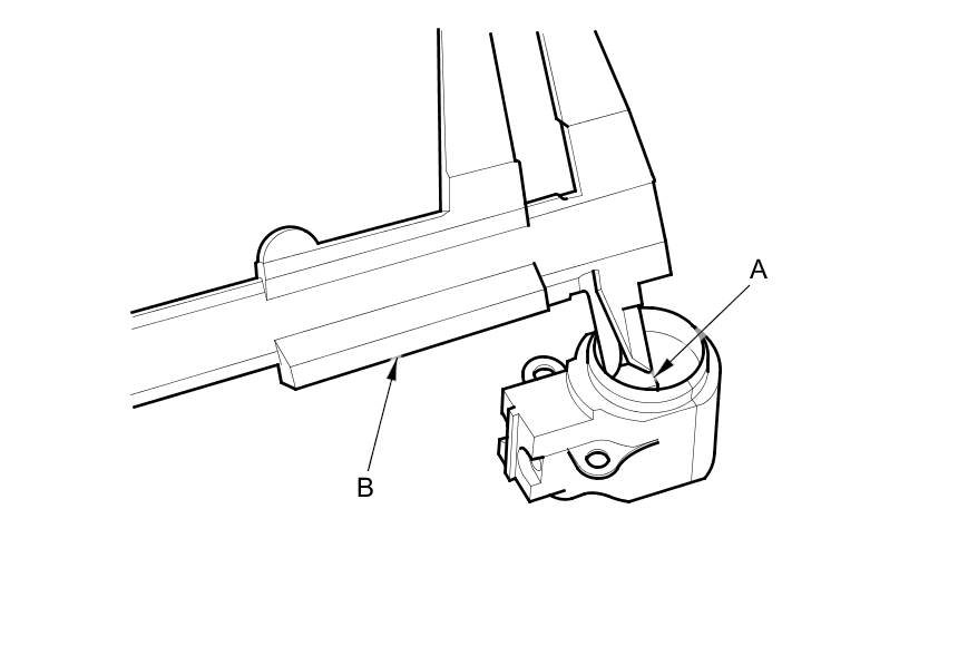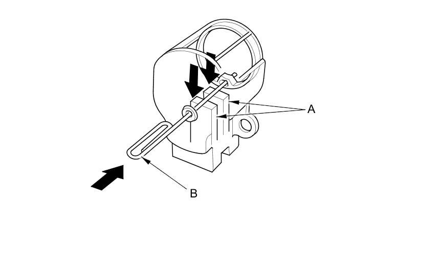 19. Push the brushes (A) in, then insert a pin or drill bit (B) (about 1.6 mm (1/16 in) diameter) to hold them there.