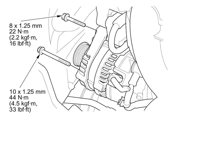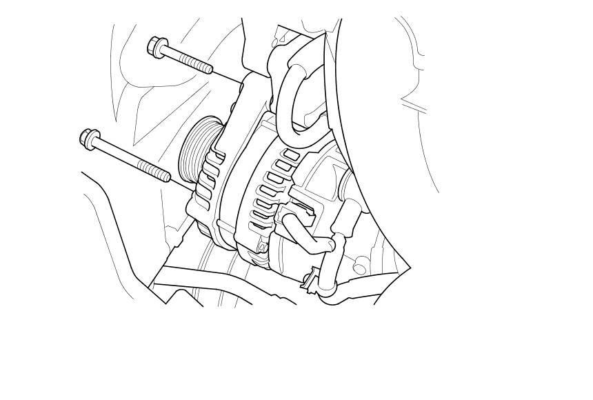 1. Install the alternator, then connect the alternator connector (A) and the positive alternator cable (B), and install the harness clamp (C). Make sure the crimped side of the ring terminal faces away from the alternator when you connect it.