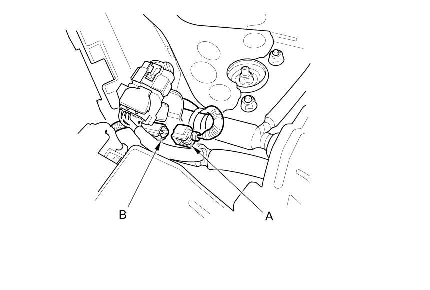 10. Make sure the shift lever is in neutral (M/T) or P or N (A/T), then disconnect the engine wire harness 1P connector (A). Connect a jumper wire from the battery positive terminal to the starter subharness 1P connector (B).