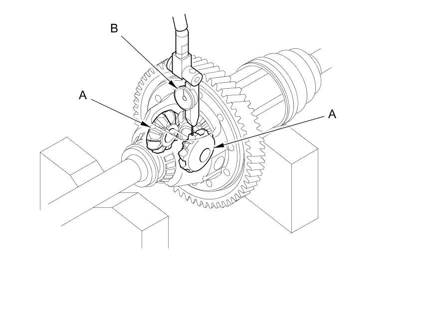 2. Check the backlash of the pinion gears (A) using a dial indicator (B).