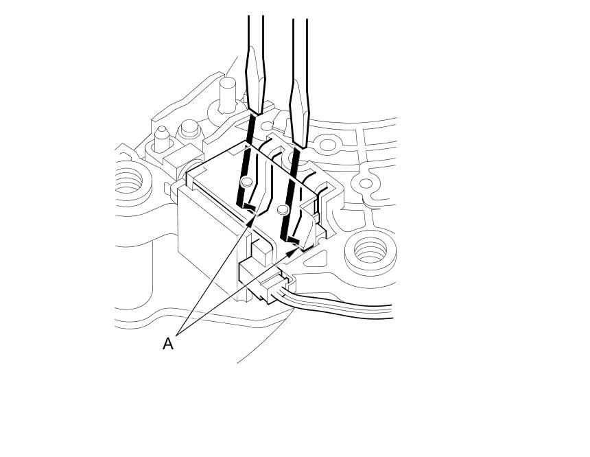 2. Release the lock tabs (A) retaining the shift lock solenoid using thin-bladed screwdrivers.