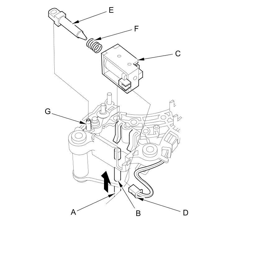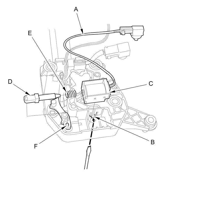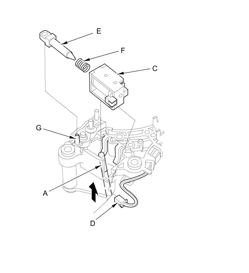 5. Replace the shift lock solenoid, the solenoid plunger (E), and the plunger spring (F) assembly.